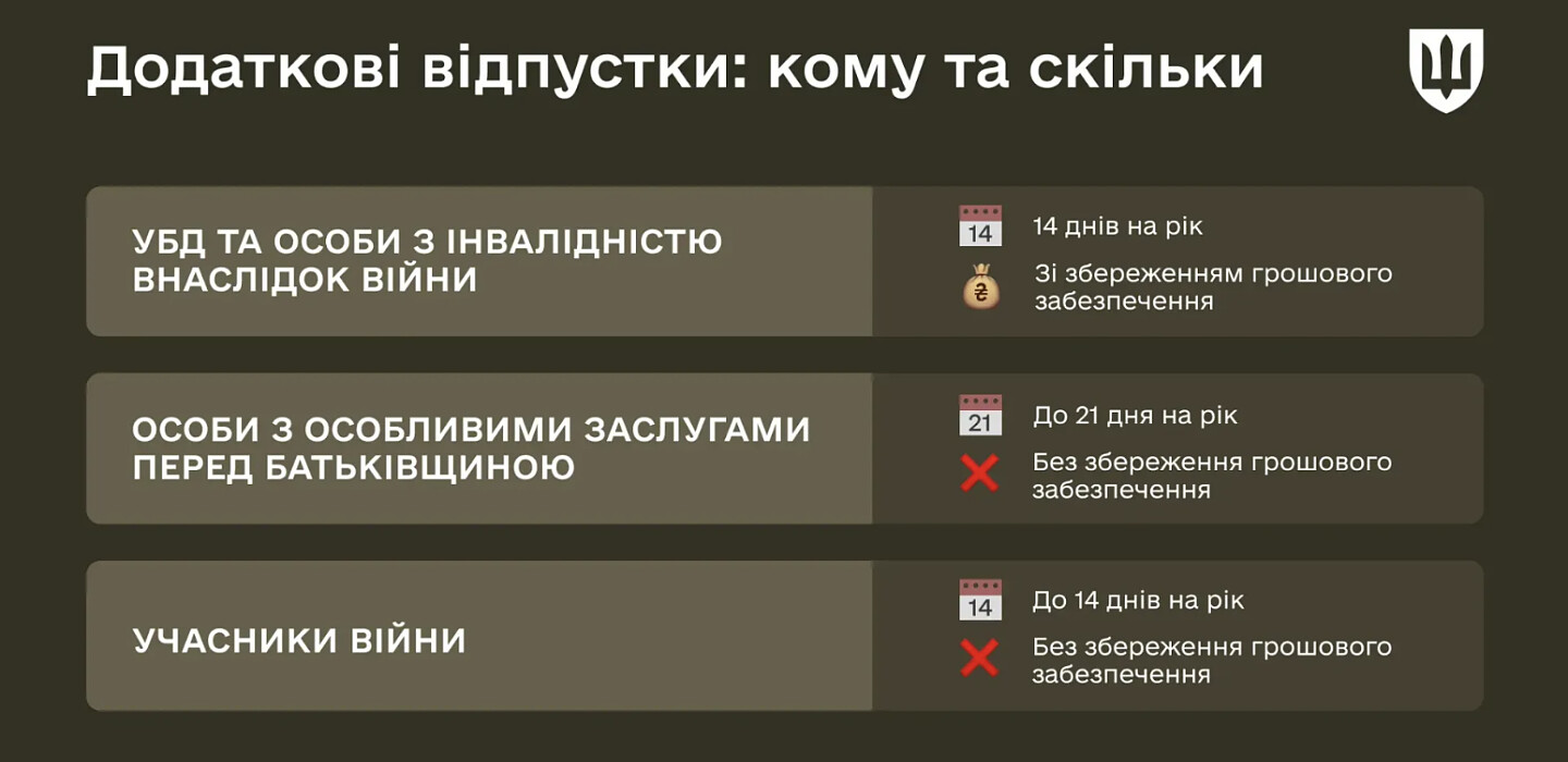 Учасники війни мають право на до двох тижнів додаткової відпустки на рік.