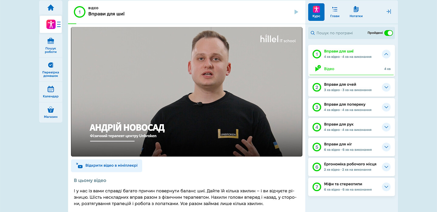 Курс, який отримав назву «(Не)шкідливі звички. Короткі вправи для твого тіла», розробили спільно з експертами Національного реабілітаційного Центру UNBROKEN та Hillel IT School. Його суть проста: допомогти зменшити втому і напругу у тілі, коли часу майже немає. Вправи займають від 2 до 5 хвилин, тож їх можна виконувати навіть під час короткої перерви між задачами.