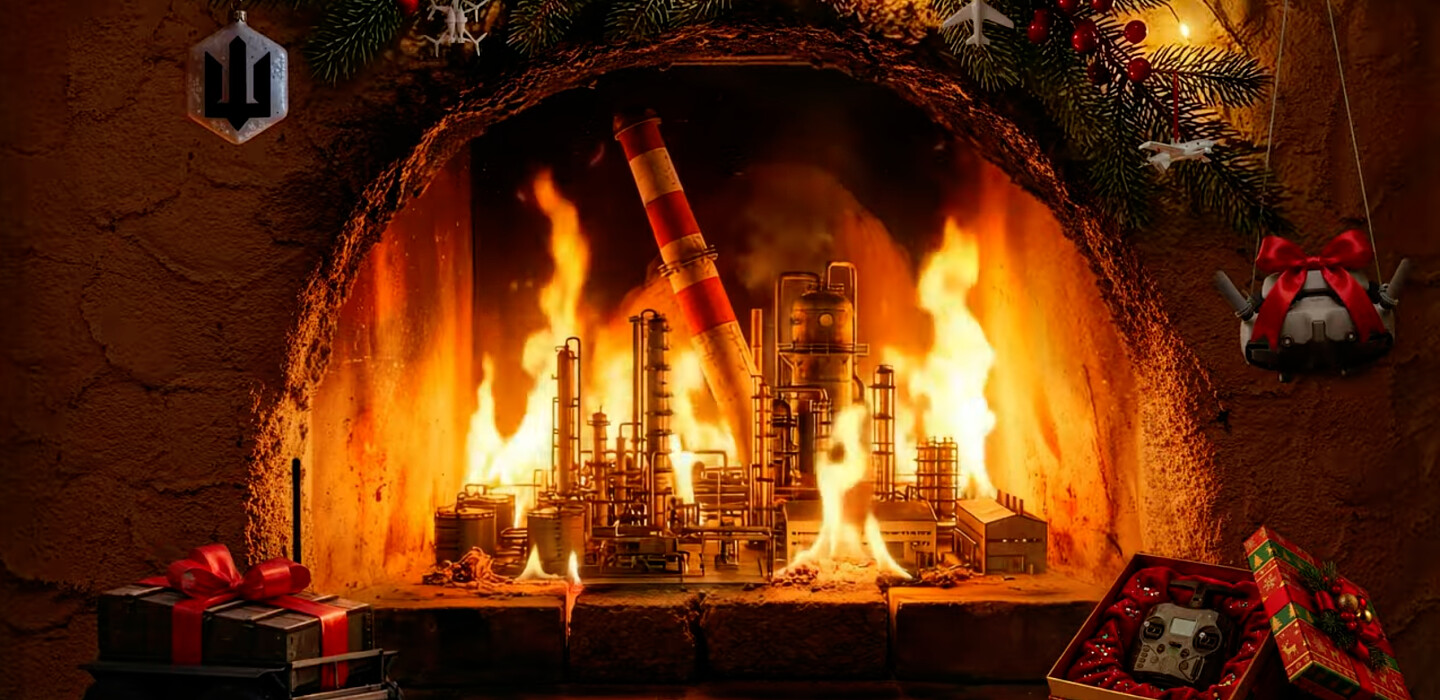 Замість традиційних дров у кадрі палає нафтопереробний завод ворога, а час від часу по ньому завдає удару безпілотник.