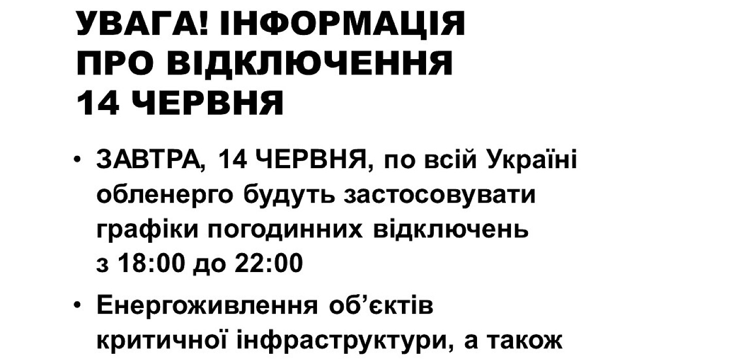 14 червня у всіх областях України обленерго будуть застосовувати графіки погодинних відключень електроенергії. Про це повідомляє «Укренерго».