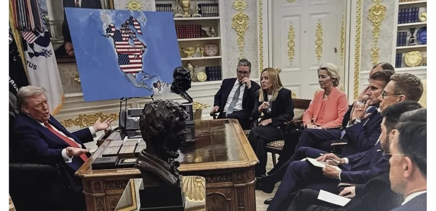 Трамп також опублікував створений за допомогою штучного інтелекту фотомакет, на якому він розмовляє з європейськими лідерами в Овальному кабінеті на тлі карти, на якій в якості території США позначена не тільки Гренландія, але і Канада.